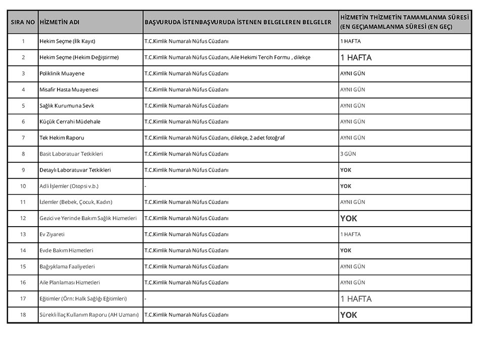 HİZMET STANDARTLARI TABLOSU
